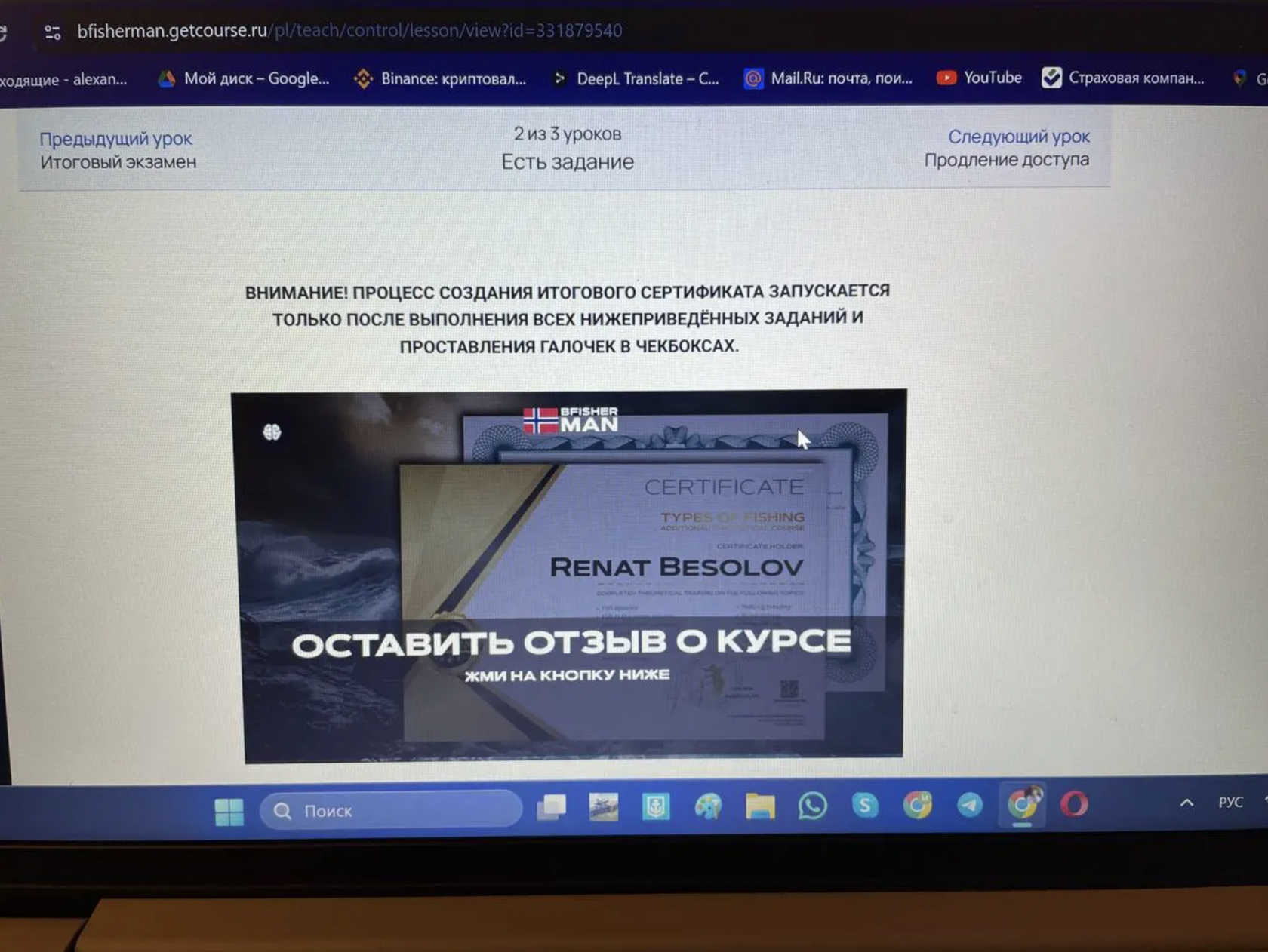 За целый курс получил очень много информации, материала, инструменты и огромное количество теории. Узнал много нового для себя о рыбном промысле Норвегии и не только. Закрыл многие вопросы для себя в ходе обучения. Курс дал много подсказок и лайфхаков для работы на судне и на суше.
