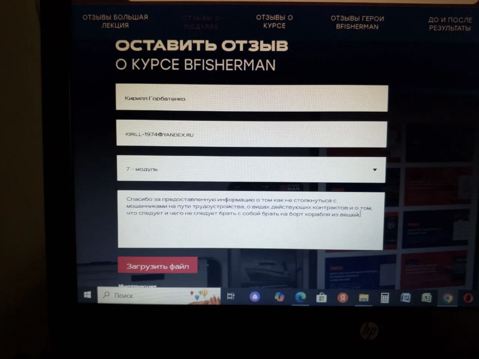 Отзыв о курсе Bfisherman. 7 - модуль. Спасибо за предоставленную информацию о том как не столкнуться с мошенниками на пути трудоустройства.